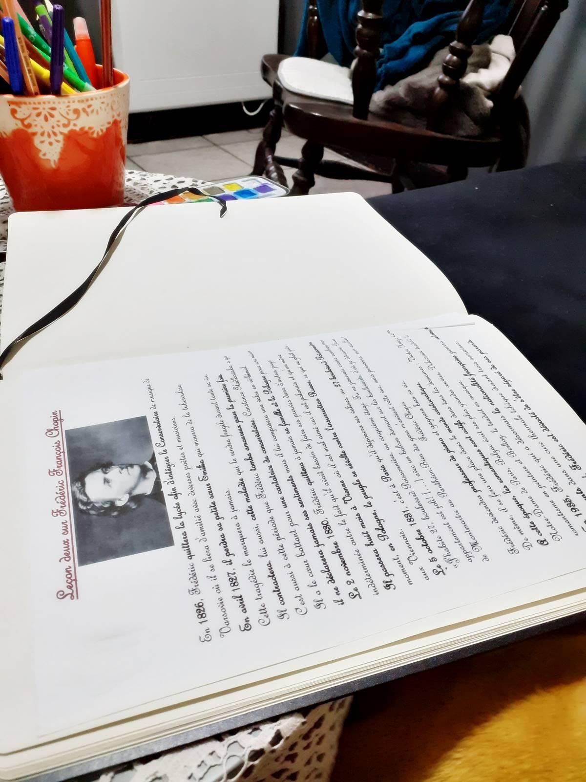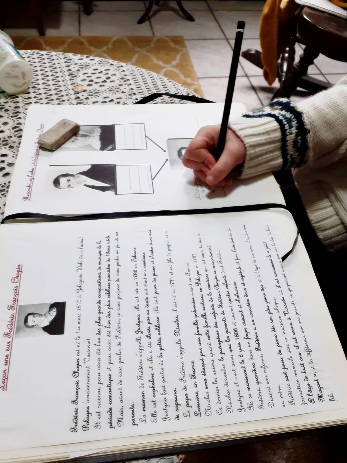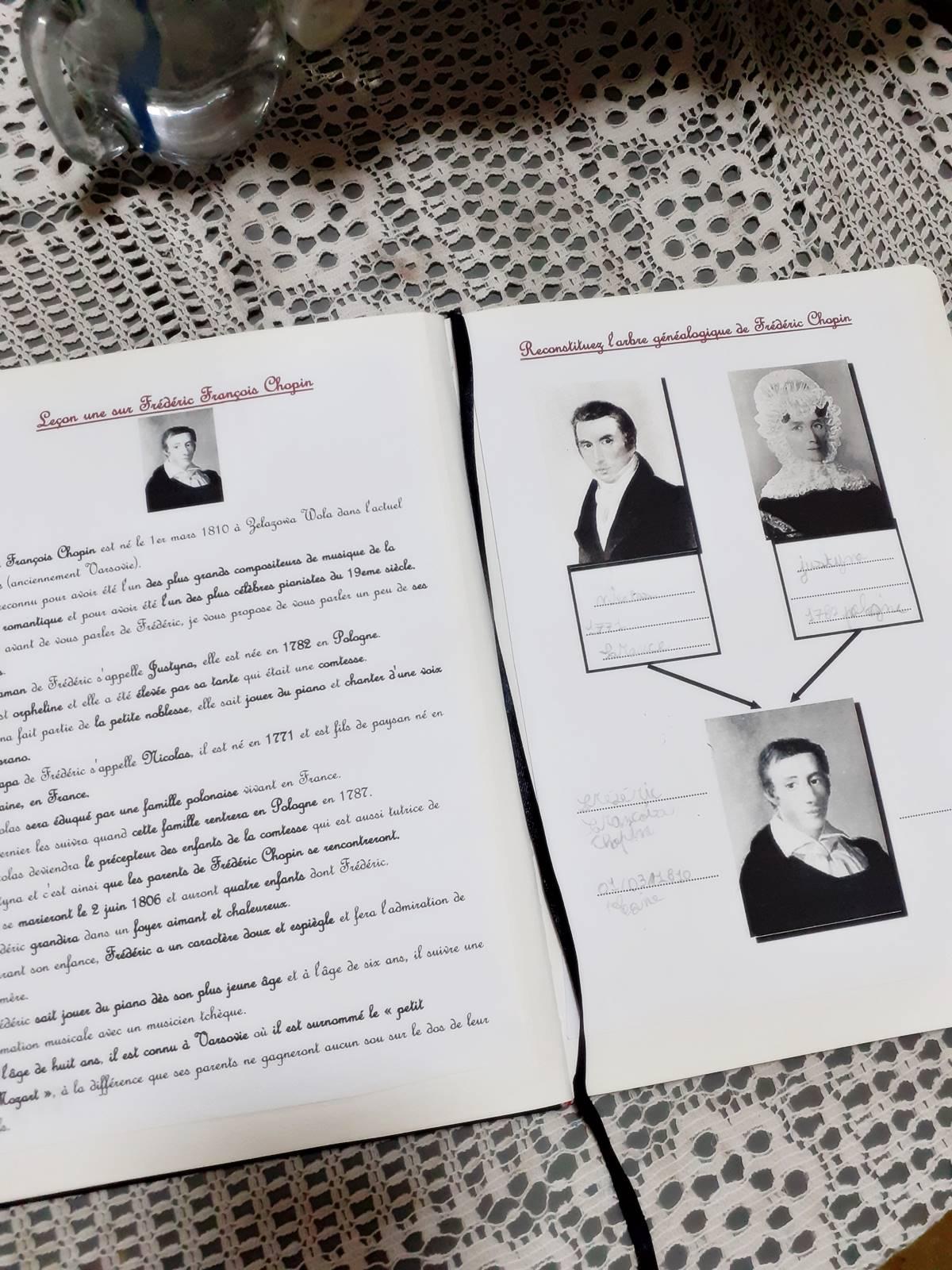 Ainsi, elle a refait l'arbre généalogique de Chopin, elle a reproduit le portrait de Chopin version Delacroix, elle a regardé une petite vidéo de deux minutes sur cet homme, elle a écouté un podcast de grande qualité (elle adore les podcasts) et on a terminé sur un questionnaire de compréhension de cours qu'elle a rempli avec brio, preuve que les leçons lui ont été instructives.