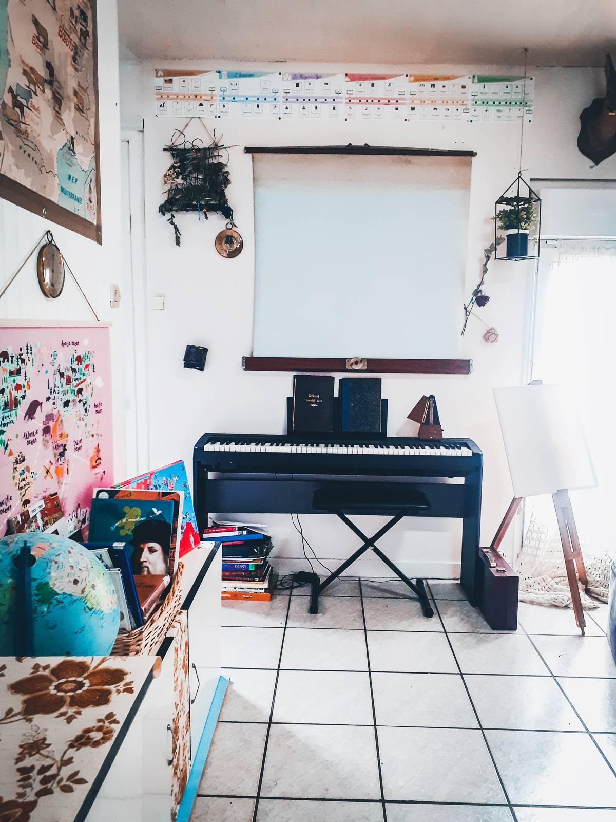 Sur le dessus du meuble de gauche, on y trouve la Kindle de Nana, l’ordinateur des enfants qu'on a acheté durant le premier confinement, ce microscope, un appareil photo numérique et des manuels scolaires anciens.