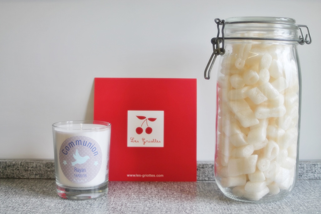 Les griottes à la superbe idée de proposer un produit personnalisé, ici au nom de mon enfant et à la date du baptême ou de la communion.